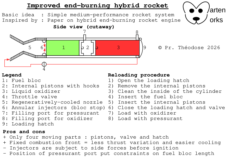 While searching for a source on end-burning solid fuel rockets, where combustion takes place from one end of the fuel bloc to the other like a cigarette, I stumbled upon a research paper on testing an end-burning hybrid rocket engine. I could see some possible improvements and simplifications concerning the lab-bench design presented in the paper and this drawing is the result. I used the same internal pistons for pressurization as in my OTRAG-style rocket to reduce the complexity of the system.